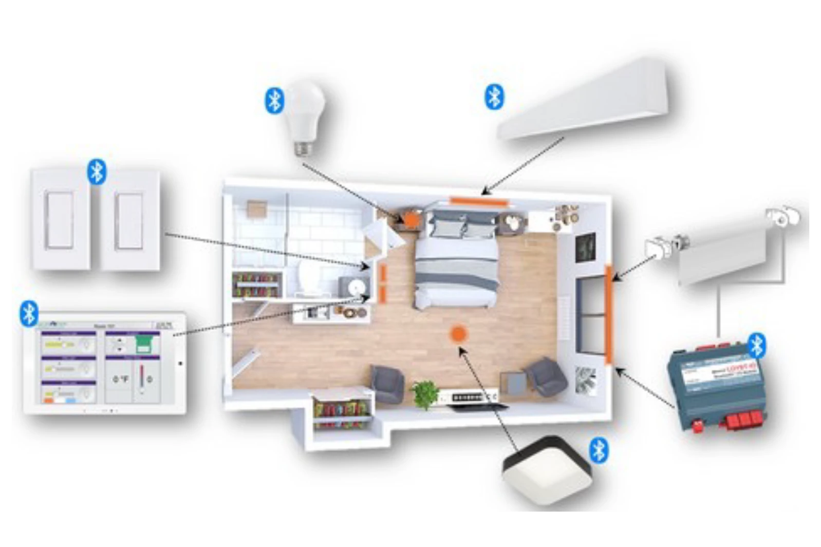 - Wireless Bluetooth Mesh SIG lighting and switches for flexible control.