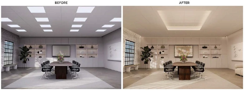 where it was once thought impossible, elevating grid ceilings from basic to breathtaking,” said Bill Plageman, VP of Marketing at Amerlux. “It’s a cost- effective option for designers and builders seeking upscale aesthetics and the impact of drywall coves—delivered faster, at lower cost and with superior performance. We’re thrilled to bring this innovative product to market.”