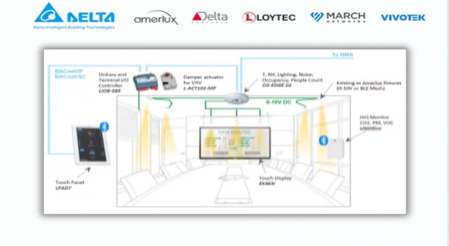Amerlux revitalized one of its conference rooms at its headquarters with an innovative environmental control solution that sets a new standard for comfort, efficiency, and productivity. The project seamlessly integrated a state-of-the-art programmable touch panel, allowing for intuitive control over lighting, HVAC, and air quality, all tailored to the specific needs of the space. Advanced architectural LED lighting was installed, elevating the room’s aesthetic while enhancing visual comfort. A flexible, modular HVAC system was deployed, coupled with intelligent air quality monitoring, ensuring the perfect balance of temperature and air purity. Motorized shades, driven by weather data, provide dynamic control for natural light, optimizing energy use. This cutting-edge solution was brought to life through Delta’s building solutions team, empowering Amerlux to create a high-performance, sustainable and smart meeting room environment.